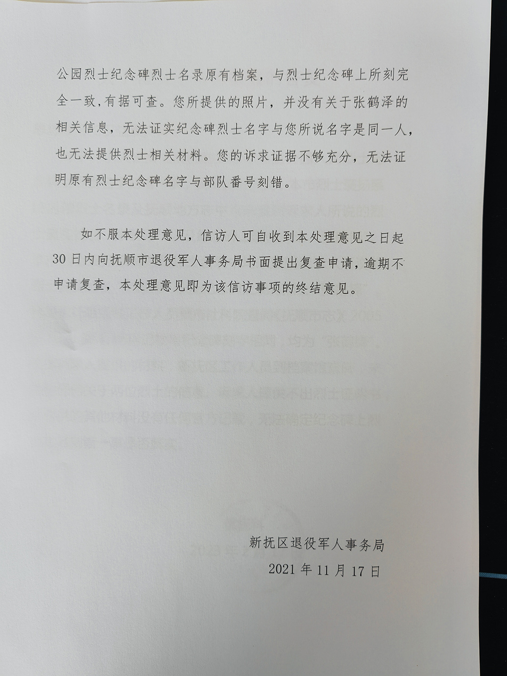两个多月后,崔秋荣又收到了抚顺市退役军人事务局的答复,其中写道:“结合信访人崔秋荣提供的相关材料来看,无证据证明该烈士纪念碑碑文有误,也无证据证明原烈士纪念碑碑文为‘张鹤泽’,且崔秋荣提供不出烈士证明书和其他能够证明其烈士身份的材料,所以不能贸然断定现碑文中的张鹤铎有误。”