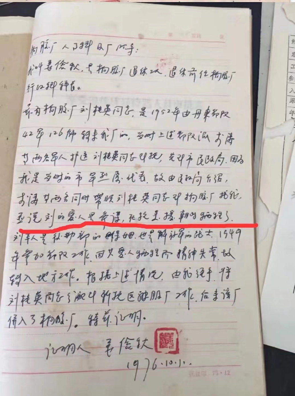 第一次吃了“闭门羹”。她让崔春安从辽阳寄给她一份委托书,第二次去她才看到了刘桂英的档案。在刘桂英的个人的档案里,记录着她于“1946年至1952年随爱人参军在部队托所(做)保育员……刘桂英同志是1952年由丹东部队42军126师转来我厂的……刘的爱人是参谋,在抗美援朝时牺牲了。刘本人是后勤部的保姆,也是解放军战士。”