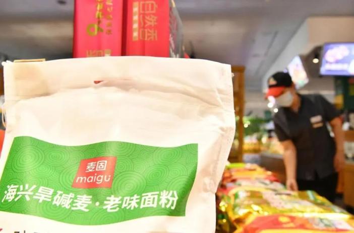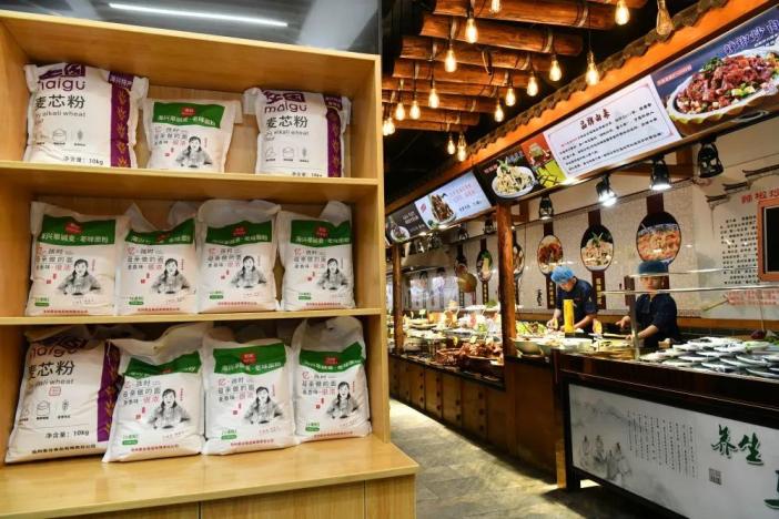 ↑7月16日拍摄的一家餐厅内的旱碱麦面粉展示柜台。(苑立伟 摄)原标题:《中央媒体看海兴 | 河北海兴:盐碱地上飘麦香》