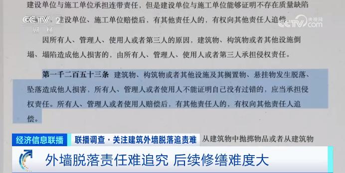 北京市京师律师事务所律师 王琮玮:无论是开发商、业主或者是物业公司,要举证来证明自己在外墙脱落这个事情上没有责任,他才能够免责。