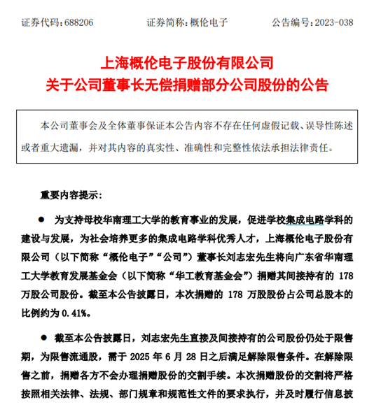 A股上市公司概伦电子17日晚间发布公司董事长无偿捐赠部分公司股份的公告,公告称,为支持母校华南理工大学教育事业的发展,促进学校集成电路学科的建设与发展,为社会培养更多的集成电路学科优秀人才,概伦电子董事长刘志宏将向广东省华南理工大学教育发展基金会(以下简称“华工教育基金会”)捐赠其间接持有的178万股公司股份。截至本公告披露日,本次捐赠的178万股股份占公司总股本的比例约为0.41%。