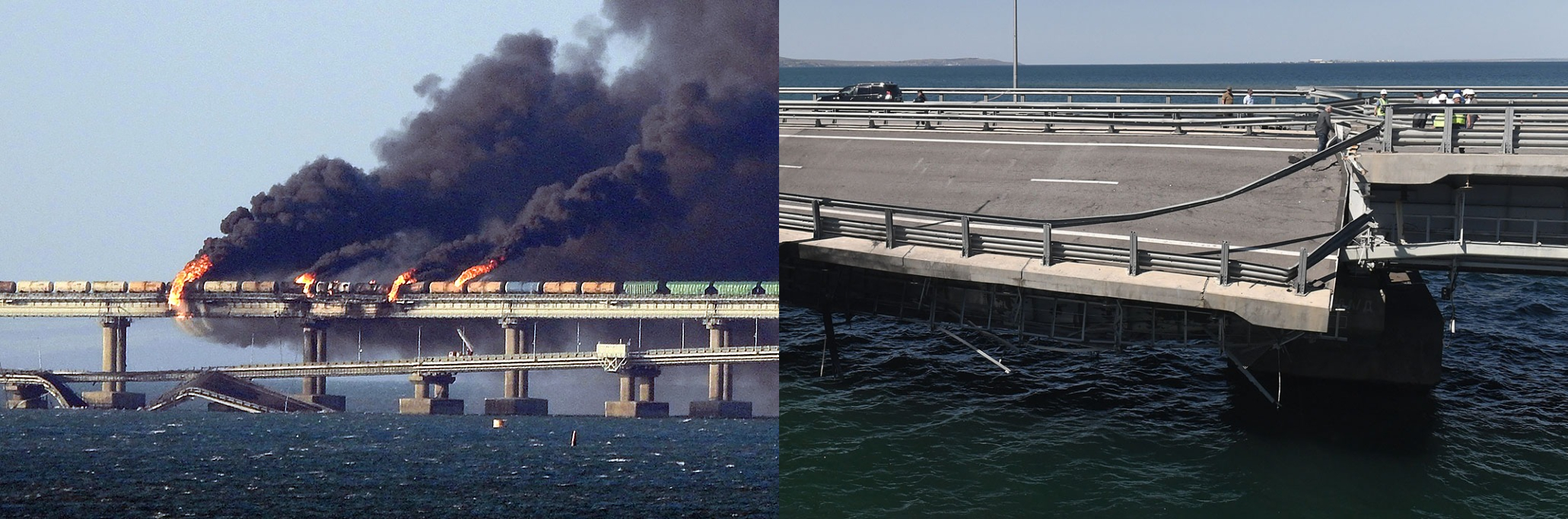 拼接图:时隔一年不到,克里米亚大桥两次遭遇袭击。