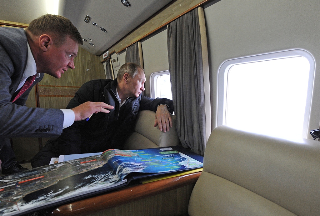 当地时间2016年3月18日,普京乘坐直升机,从空中俯瞰刻赤海峡附近区域。