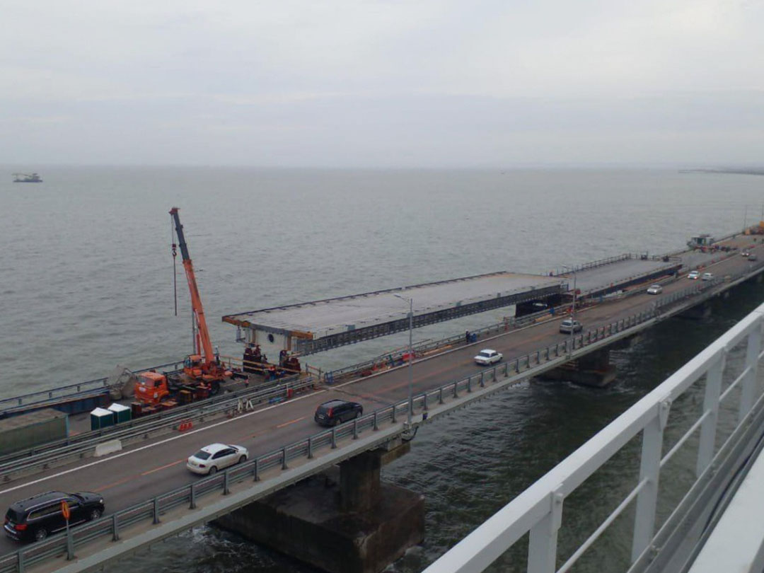 当地时间2022年11月19日,克里米亚公路大桥被炸断的桥面的预安装工作已全部完成,克里米亚大桥的公路桥部分已恢复通车。