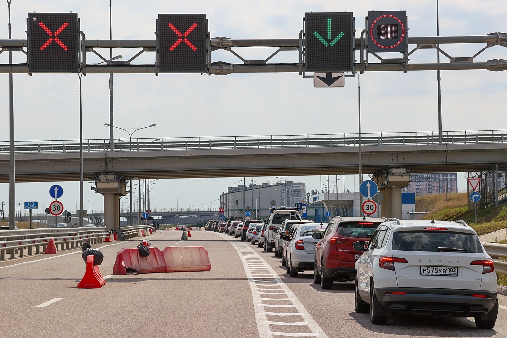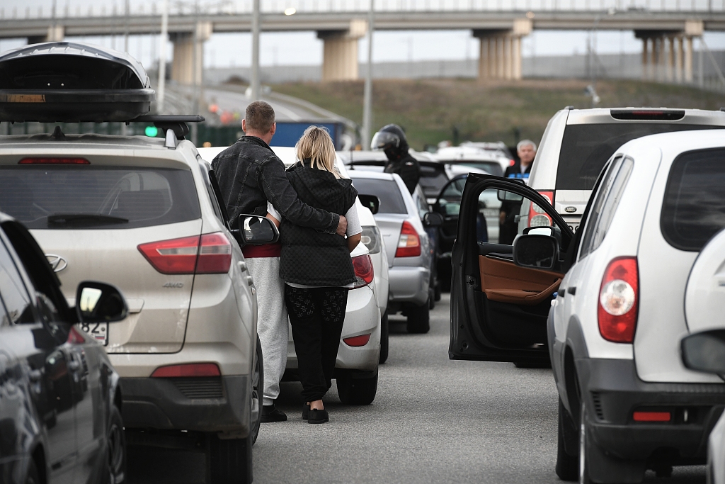 当地时间2022年10月8日,在克里米亚大桥入口处,出现汽车拥堵现象。