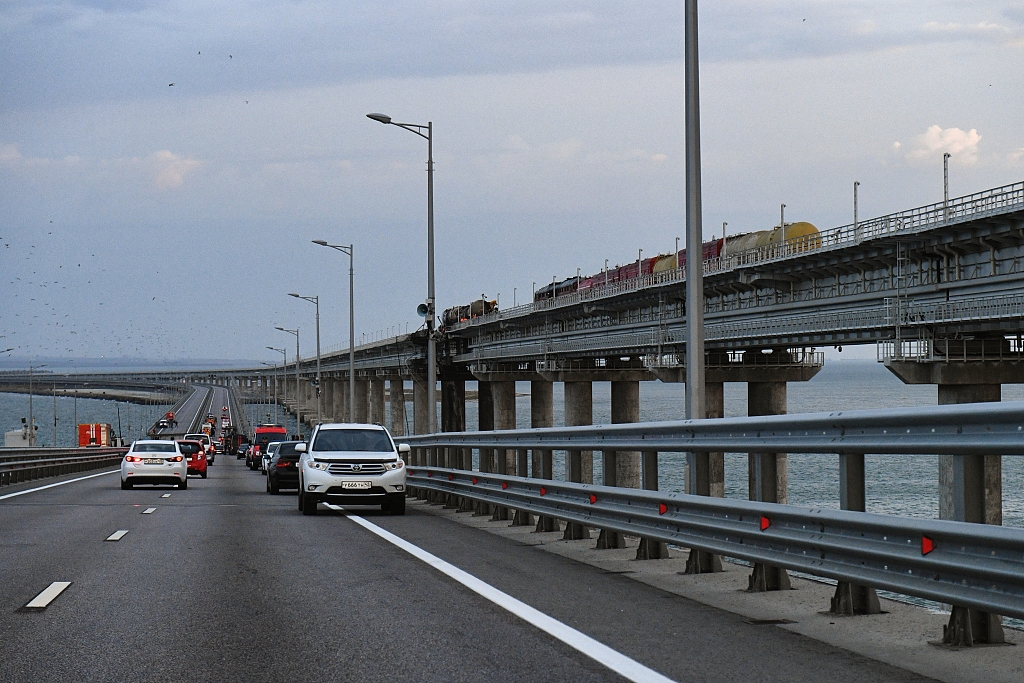 当地时间2023年2月23日,车辆行驶在克里米亚大桥上。