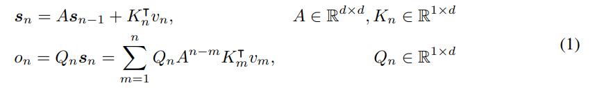 其中,将 v_n 映射到状态向量 s_n,然后实现线性变换,对序列信息进行循环编码。接下来,使投影 Q_n, K_n 具有内容感知能力: