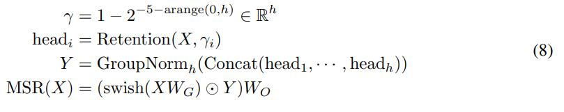 Sub-LayerNorm:如公式(8)所示,retention 层使用 Sub-LayerNorm [WMH^+22] 对输出进行归一化。由于多尺度建模导致不同头的方差不同,研究者将原始的 LayerNorm 替换为 GroupNorm。