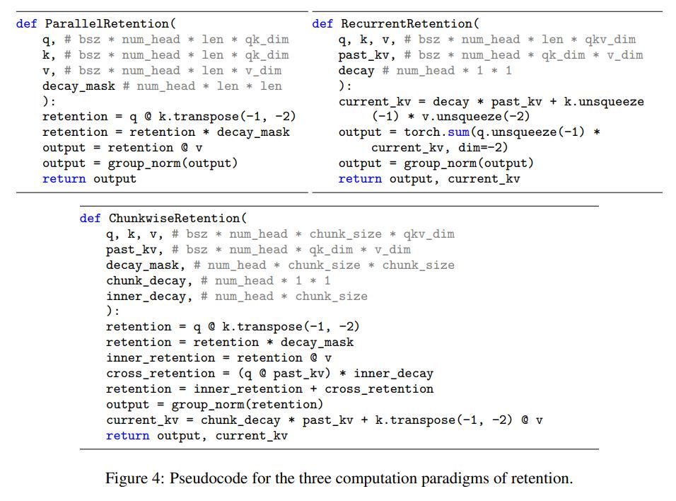AFT/RWKV:Attention Free Transformer (AFT) 简化了点积对元素运算的关注,并将 softmax 移动到关键向量。RWKV 用指数衰减取代 AFT 的位置嵌入,并循环运行模型进行训练和推理。相比之下,retention 保留了高维状态来编码序列信息,有助于提高表达能力和性能。
