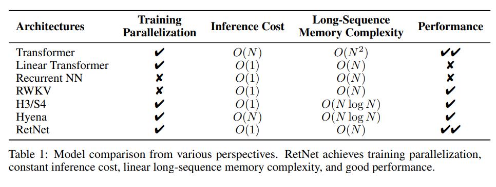 表 1 从不同角度对 RetNet 与以往的方法进行了比较。对比结果与图 2 所示的「不可能三角」相呼应。此外,RetNet 对于长序列具有线性记忆复杂性,因为它采用了分块循环表示。