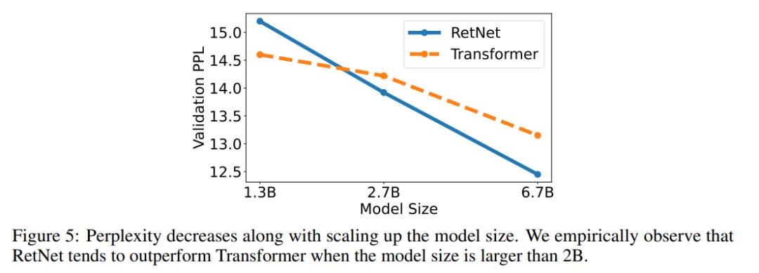 更重要的是,这一结果还表明了 RetNet 在大小扩展方面更具优势。除了性能优势外,实验中 RetNet 的训练也非常稳定。RetNet 是 Transformer 的有力竞争对手。研究者根据经验发现,当模型规模大于 2B 时,RetNet 开始超越 Transformer。