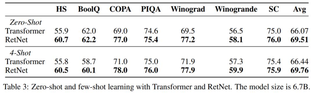 该研究还在各种下游任务上对语言模型进行了比较。他们使用 6.7B 大小的模型进行了零样本和 4 个样本学习的评估,如表 3 所示。表中展示的关于准确率的数字与图 5 中呈现的语言建模困惑度一致。在零样本学习和上下文学习设置中,RetNet 在性能上与 Transformer 相当。