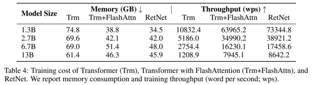 训练成本表 4 比较了 Transformer 和 RetNet 在训练速度和内存开销方面的结果,其中训练序列长度为 8192。此外,该研究还将其与 FlashAttention 进行了比较。