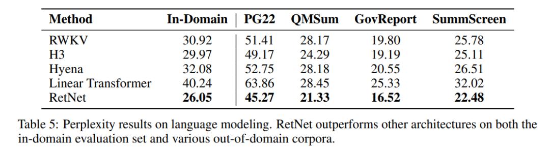 下表表明,RetNet 在不同的数据集上优于先前的方法。RetNet 不仅在领域内语料库上取得更好的评估结果,还在几个领域外数据集上获得更低的困惑度。这种优越的性能使得 RetNet 成为 Transformer 的有力继任者。