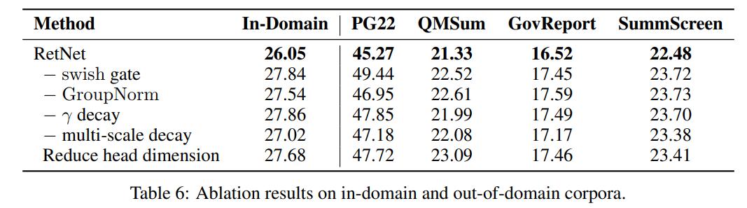消融实验下表列出了 RetNet 的各种设计选择,并在表 6 中报告了语言建模结果。