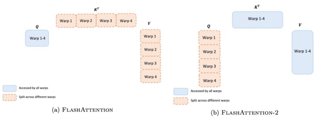 研究者改进了 FlashAttention-2 中的这种分区,减少不同 warp 之间的同步和通信量,进而减少共享内存读写。