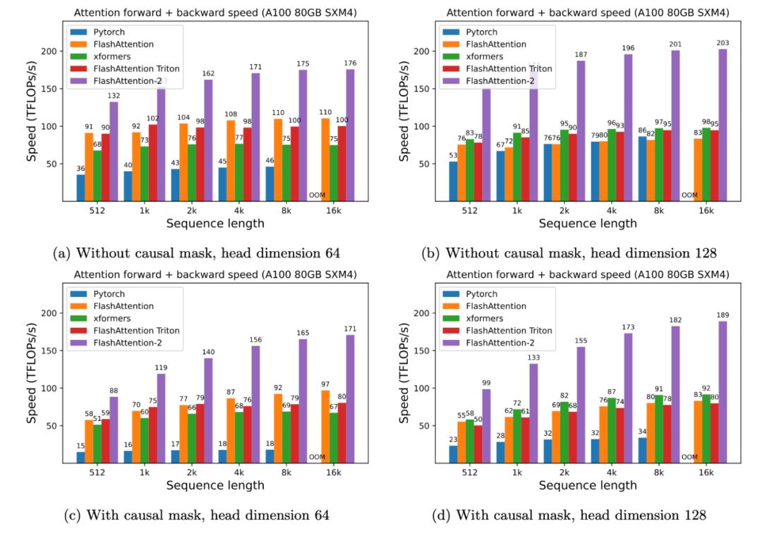 结果发现, FlashAttention-2 的速度是 FlashAttention(以及 xformers 库和 Triton 中的其他实现)的 2 倍。与 PyTorch 中的标准注意力实现相比,FlashAttention-2 的速度最高是它们的 9 倍。