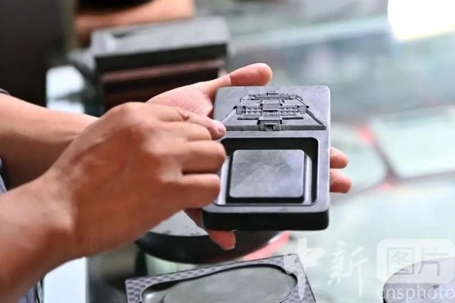 7月13日,在甘肃省兰州市一洮砚技艺传习所内,38岁的李江平展示刻有“卓尼土司衙门旧址”的洮砚作品。