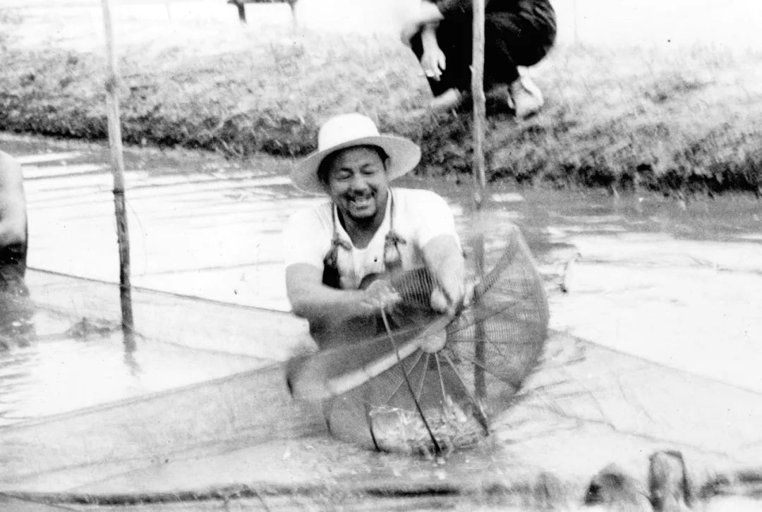 20世纪60年代,金万昆在鱼塘中劳动(资料照片)。新华社发