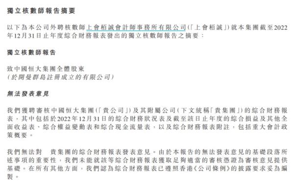对这两份年报,中国恒大的外聘核数师上会栢诚会计师事务所表示,对该年报无法发表意见。“中国恒大未来现金流量的不确定性对集团继续持续经营的能力产生重大疑虑。我们认为,综合财务报表已就此情况作出适当披露,但我们无法就贵集团偿付到期财务责任的能力获取足够审核凭证,而我们认为有关持续经营基础的此等重大不确定性对综合财务报表的潜在累计影响重大,以致我们无法发表意见。”