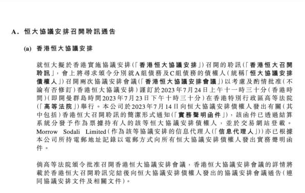 此外,7月17日晚,中国恒大在联交所发布关于境外债务重组最新消息的公告,就恒大拟于香港实施协议安排召开的聆讯,会上将寻求颁令分别就A组债务及C组债务的债权人召开两次协议安排会议以考虑及酌情批准,谨定于2023年7月24日上午十一时三十分在香港特别行政区高等法院举行。公司于2023年7月14日向恒大协议安排债权人发出有关(其中包括)香港恒大召开聆讯的简洁形式通知,该函件已透过结算系统分发予作为票据持有人的该等恒大协议安排债权人,并于交易网站登载。Morrow Sodali Limited(作为该等协议安排的信息代理人)亦已根据公司所持电邮地址记录以电邮方式向所有恒大协议安排债权人发出实务声明函件。