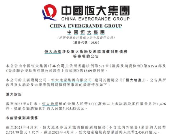就在上月初,今年6月1日,中国恒大发布恒大地产涉及重大诉讼及未能清偿到期债务等重大事项的公告,截至2023年4月末,发行人标的金额3000万元以上未决诉讼案件数量共计1426件,标的金额总额累计约3495.53亿元。