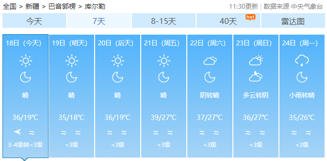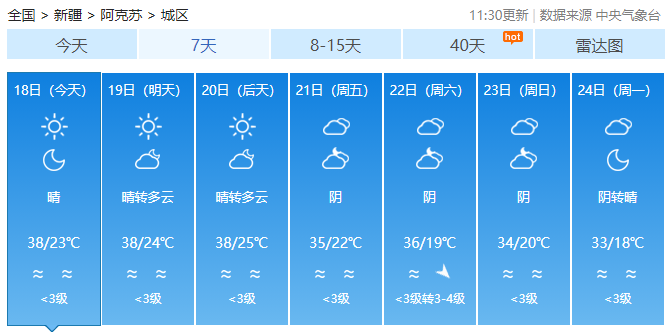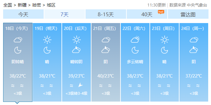 7月17日,新疆多地持续“火热”。当日15时,中央气象台的全国最高气温实况排行榜再次被新疆包揽,上榜10地均在40℃以上。