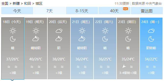 今日至21日白天,南疆、东疆和伊犁哈萨克自治州西部、塔城地区北部、阿勒泰地区、天山北坡等地的部分区域最高气温可在37℃以上,博尔塔拉蒙古自治州、塔城地区、克拉玛依市、石河子市、昌吉回族自治州、乌鲁木齐市北部、喀什地区、和田地区、阿克苏地区等地的部分区域最高气温可在40℃以上。新疆气象台7月14日12时12分发布的高温红色预警信号继续有效。