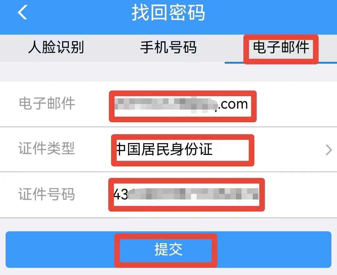 输入注册时所用的手机号和证件类型等信息,点击“提交”进入获取验证码页面,根据提示获取验证码并输入,提交后进入设置新密码页面,根据提示设置密码。