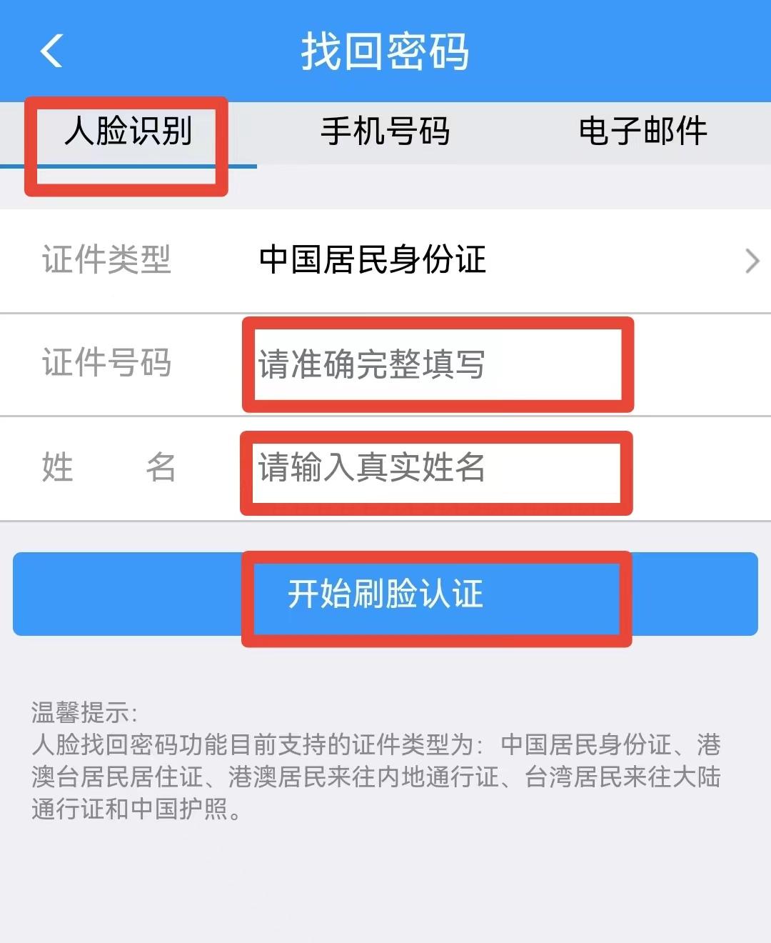 输入注册时所填写的证件号码和姓名,点击“开始刷脸认证”,点击“已阅读并同意认证服务协议、隐私权政策”和“开始核验”进行刷脸验证,通过后进入“补全账户信息”页面,根据提示信息设置新密码。