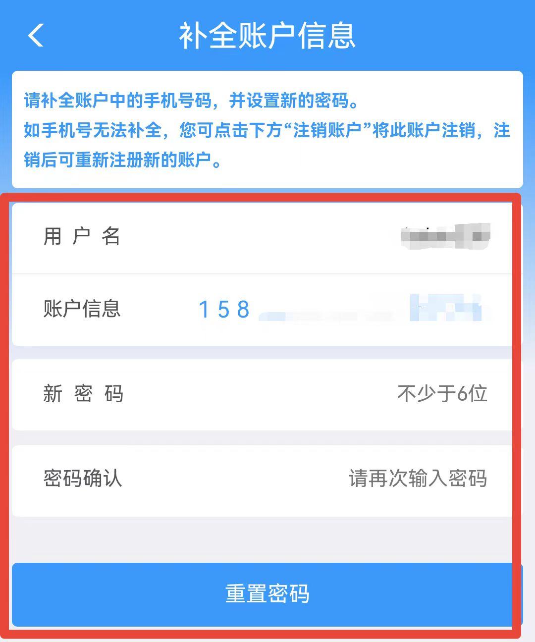 输入注册时所用的手机号、证件号码等信息,填写新密码并获取验证码,提交后即可启用新密码。