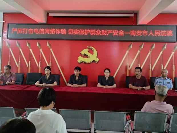 7月14日上午,南安法院刑事法官前往南安市省新镇檀林村,开展防范涉电信网络诈骗专题讲座,向在场群众深入浅出地讲解电信网络诈骗10种常见类型,分析电信网络诈骗常用“套路”,以案释法揭露境外高薪招聘真相以及如何正确防范电信网络诈骗,为群众提供相关法律咨询,分发防诈宣传册200余册。
