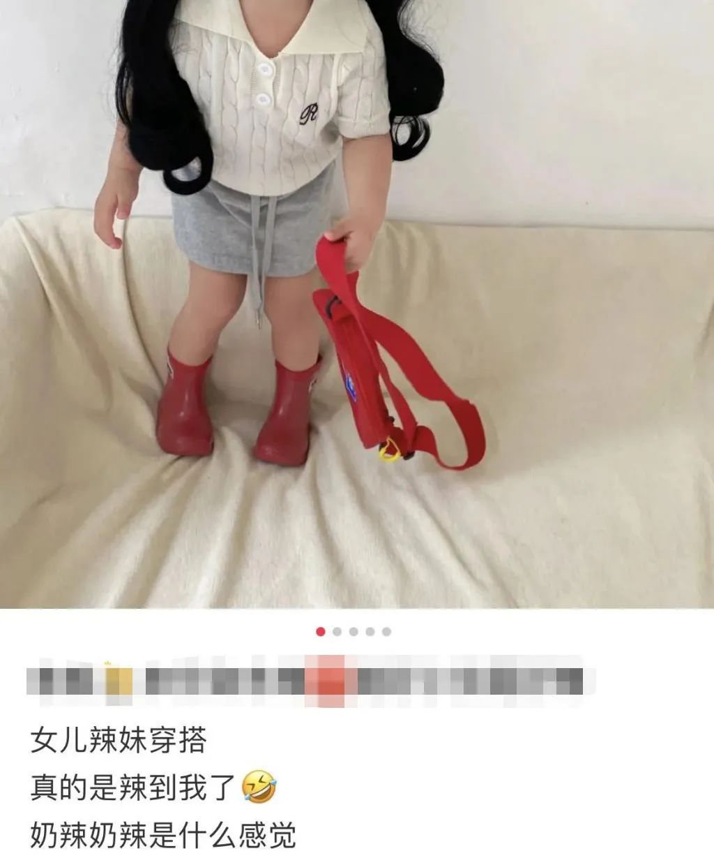 比如,“被迫成熟”的孩子出现在地铁、大街上:露胸掐腰还不够,还得配上小皮包珍珠项链走秀;1:1复刻成人辣装,挺胯叉腰扭肩的摆拍姿势同样完美复刻;还有些脚指头涂上了鲜艳的红色指甲油。再配上“今天给孩子穿这套被好几个人说了”“据说这是老父亲不允许女儿穿的风格?我不管反正是麻麻喜欢的样子”之类的文案,孩子俨然成了吸引流量的手段。