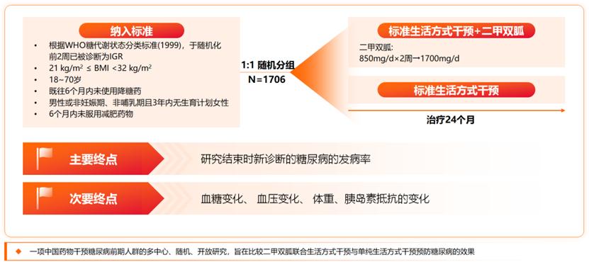 CDPP(China Diabetes Prevention Program)是一项多中心、开放标签、随机、对照临床研究,于2017年4月正式入组受试者,2021年6月完成随访。研究共纳入我国43家医院1706例成人糖尿病前期受试者,以1:1比例予以标准生活方式干预或标准生活方式干预+二甲双胍治疗24个月,并根据血压、降压药物使用和糖耐量进行分层随机。主要终点为研究结束时新诊断糖尿病的发病率,次要终点包括不同代谢指标的变化(图1)。