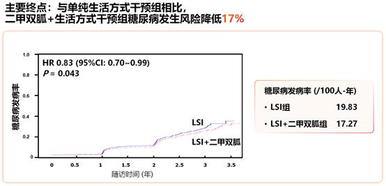 结果显示,生活方式干预组和二甲双胍+生活方式干预组的糖尿病发病率分别为19.83例/100人-年和17.27例/100人-年;与单纯生活方式干预相比,二甲双胍+生活方式干预显著降低糖尿病发生风险达17%(HR 0.83,95%CI:0.70~0.99,P=0.043,图2)。