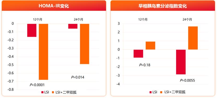 图2. 二甲双胍+生活方式干预显著降低糖尿病发生风险达17%`治疗24个月时,与单纯生活方式干预相比,二甲双胍+生活方式干预显著降低糖尿病前期人群的体重(-1.16 kg vs. -2.11 kg,P=0.0002)和BMI(-0.43 kg/m^2 vs. -0.76 kg/m^2,P=0.0003)。二甲双胍+生活方式干预治疗24个月还可改善糖尿病前期人群的胰岛素敏感性和早相胰岛素分泌指数(提示β细胞功能得到改善)(图3)。