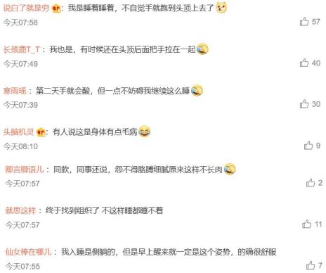 图片来源:微博不同于婴儿举手时放在脸侧的高度,成人如果采用“投降式睡姿”,往往会让双手高举过头,且姿势多不端正,虽然片刻感觉很舒服,但是时间并不宜太久。因此严格来说,并不属于推荐睡姿之列。