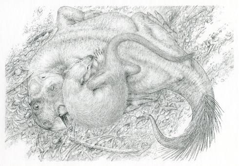 情境重现:1.25 亿年前,植食性恐龙遭到肉食性哺乳动物的攻击。迈克尔·W·斯克雷普尼克供图研究者相信,爬兽是在捕食鹦鹉嘴龙,而不是在啃食一具鹦鹉嘴龙的尸体,因为恐龙骨架上没有留下任何被啃食的牙印。“如果鹦鹉嘴龙在遇到爬兽前就死了,那么两只动物就不太可能纠缠一起。此外,爬兽位于鹦鹉嘴龙的背方,也表明它是攻击者。”在马隆看来,爬兽实际上是想在鹦鹉嘴龙还活着时就吃掉它,只是它们同时葬身于即时的火山喷发以及随后的泥石流中。