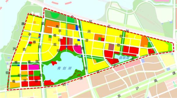 通过交通引导及生态引导的开发模式,将青剑湖周边地块打造成区域商务活力中心和区域文旅商业中心。