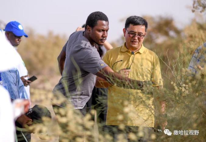 来自尼日利亚的非洲荒漠化控制倡议组织负责人奥马尔·丹拉迪·达希鲁得知梭梭树有耐旱、耐盐碱地等特点,他找到中国科学院新疆生态与地理研究所研究员徐新文,边说边比划,想知道梭梭树能否通过扦插而不是播种培育。