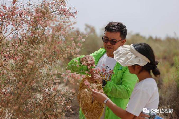 2023年6月12日,在中科院新疆生态与地理研究所策勒沙漠研究站天然试验区,买尔当和学生查看沙拐枣生长情况。新华社记者 郝昭摄(三)