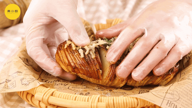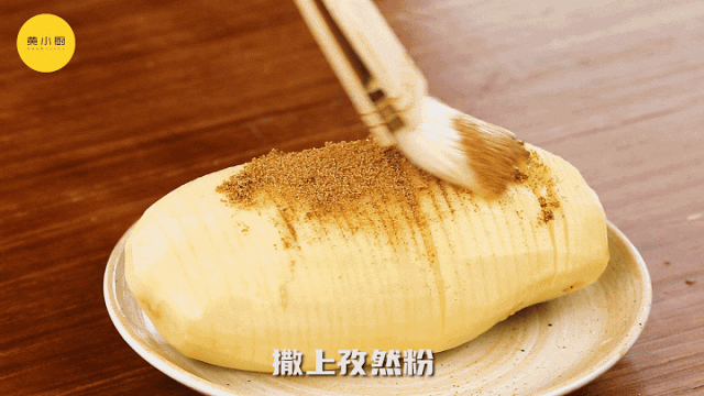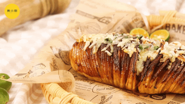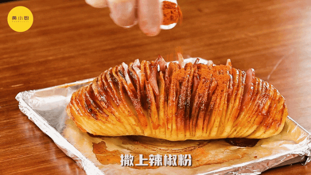 土豆削皮,切片(注意不要切断);切好的土豆撒上孜然粉、黑胡椒粉、盐,放进烤箱210度,烤40分钟;
