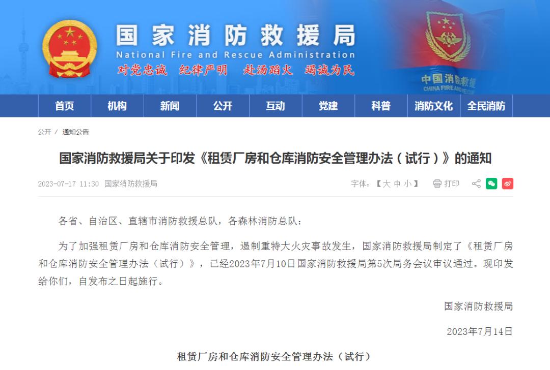 近日,国家消防救援局第5次局务会议审议通过《租赁厂房和仓库消防安全管理办法(试行)》,自2023年7月17日起施行。全文如下:租赁厂房和仓库消防安全管理办法(试行)