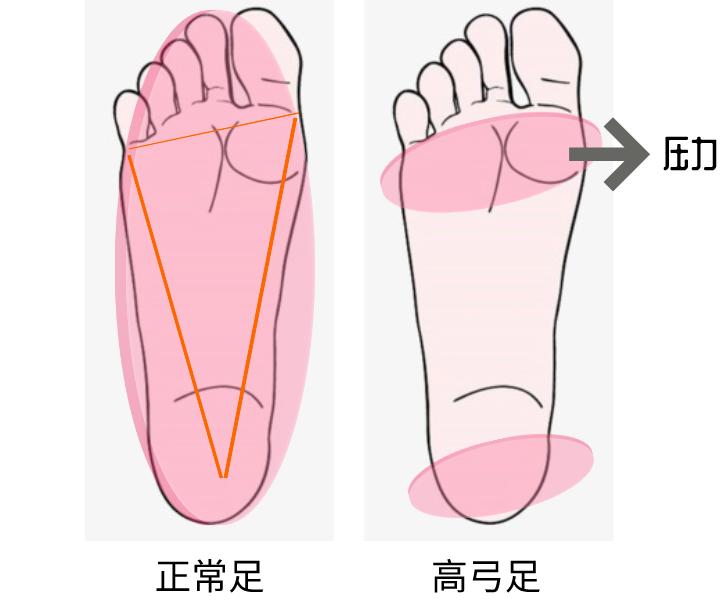 足底正常的普通人在站立时,体重的压力会均匀地分布在整个足部。而高足弓的人,压力会过多地集中在前脚掌和脚后跟,导致这两个地方很容易感觉酸痛,路走得多一点都受不了。
