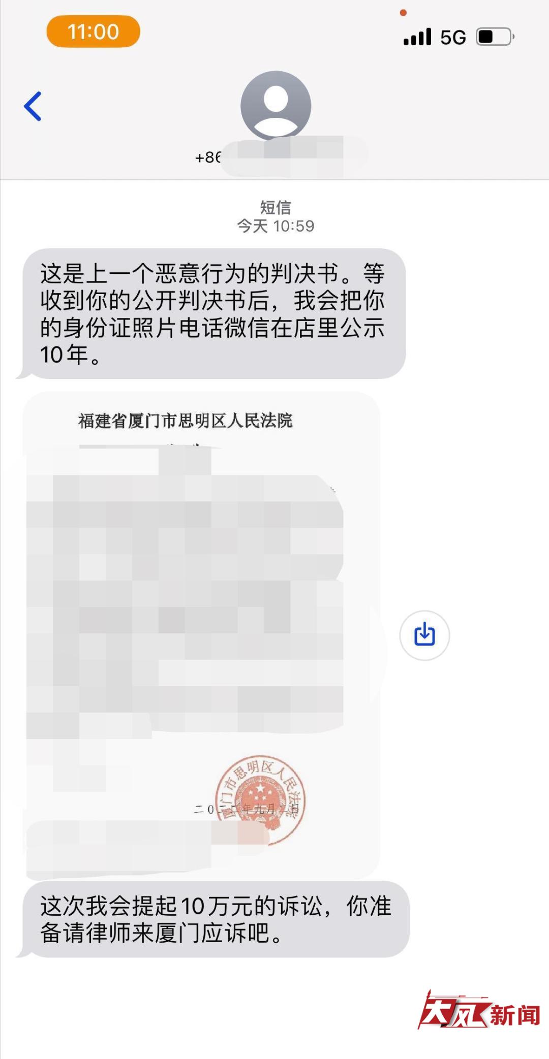 此后,旅店负责人又给王女士发来一条短信:这次我会提起10万元的诉讼,你准备请律师来厦门应诉吧。