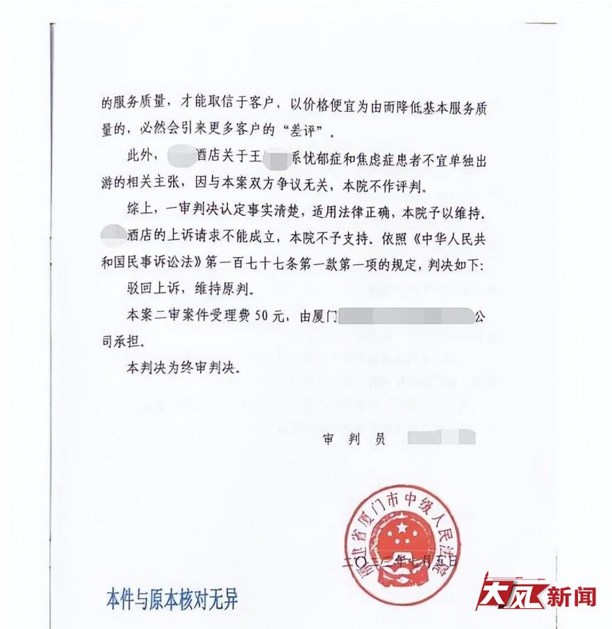 2023年4月,厦门市思明区法院一审判决:驳回旅店和王女士的全部诉讼请求。
