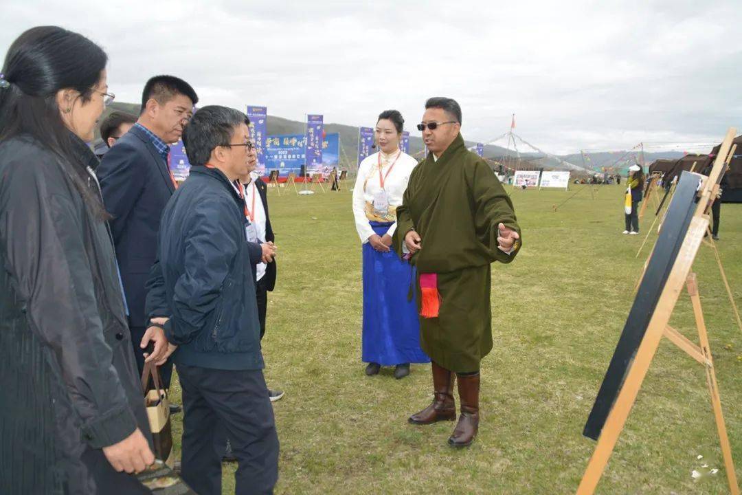 2023年5月21日,第十一届全国藏棋比赛开幕式期间,阿坝县委副书记、县长龙真泽郎(右)向参加开幕式的嘉宾介绍阿坝县藏棋发展史 (龚伟 摄)