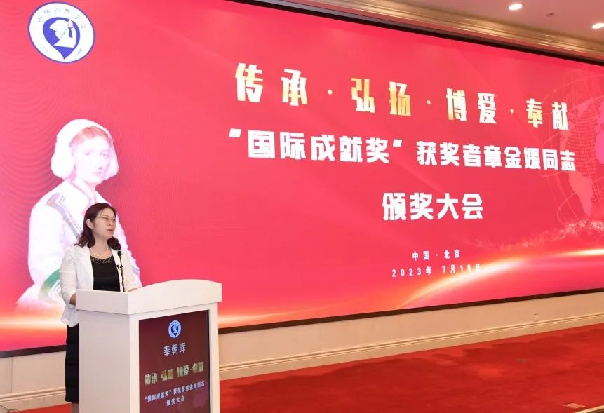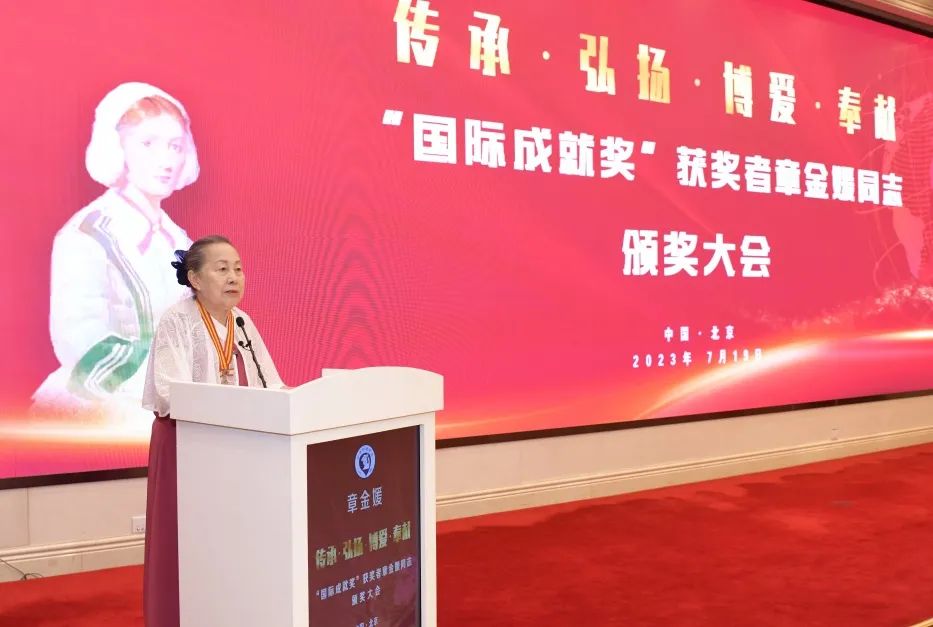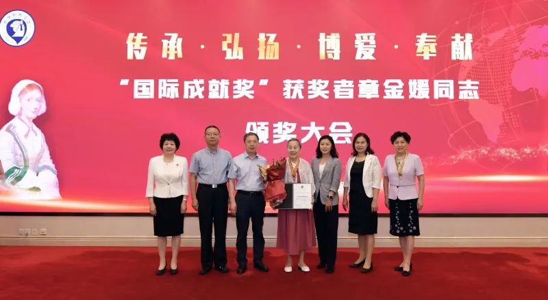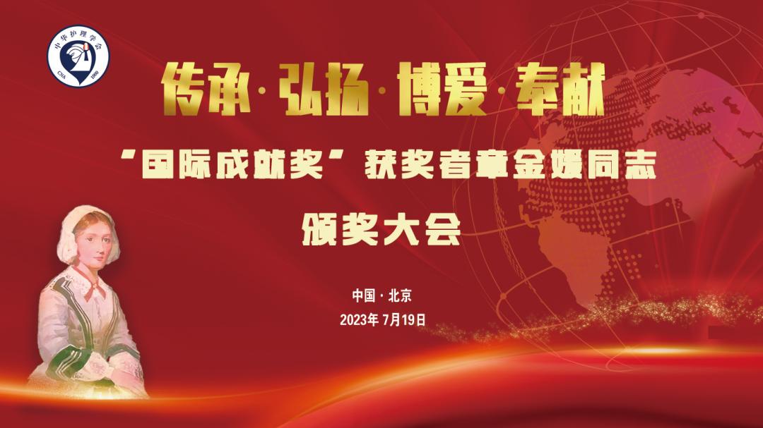 2023年7月19日,“国际成就奖”获奖者章金媛同志颁奖大会在北京隆重召开。国家卫生健康委、中国科协、全国妇联、中国红十字会总会、江西省卫生健康委、“国际成就奖”获奖者章金媛、南丁格尔奖章获得者及志愿服务总队代表、中华护理学会、江西省护理学会代表、在京部分医院护士代表出席大会。