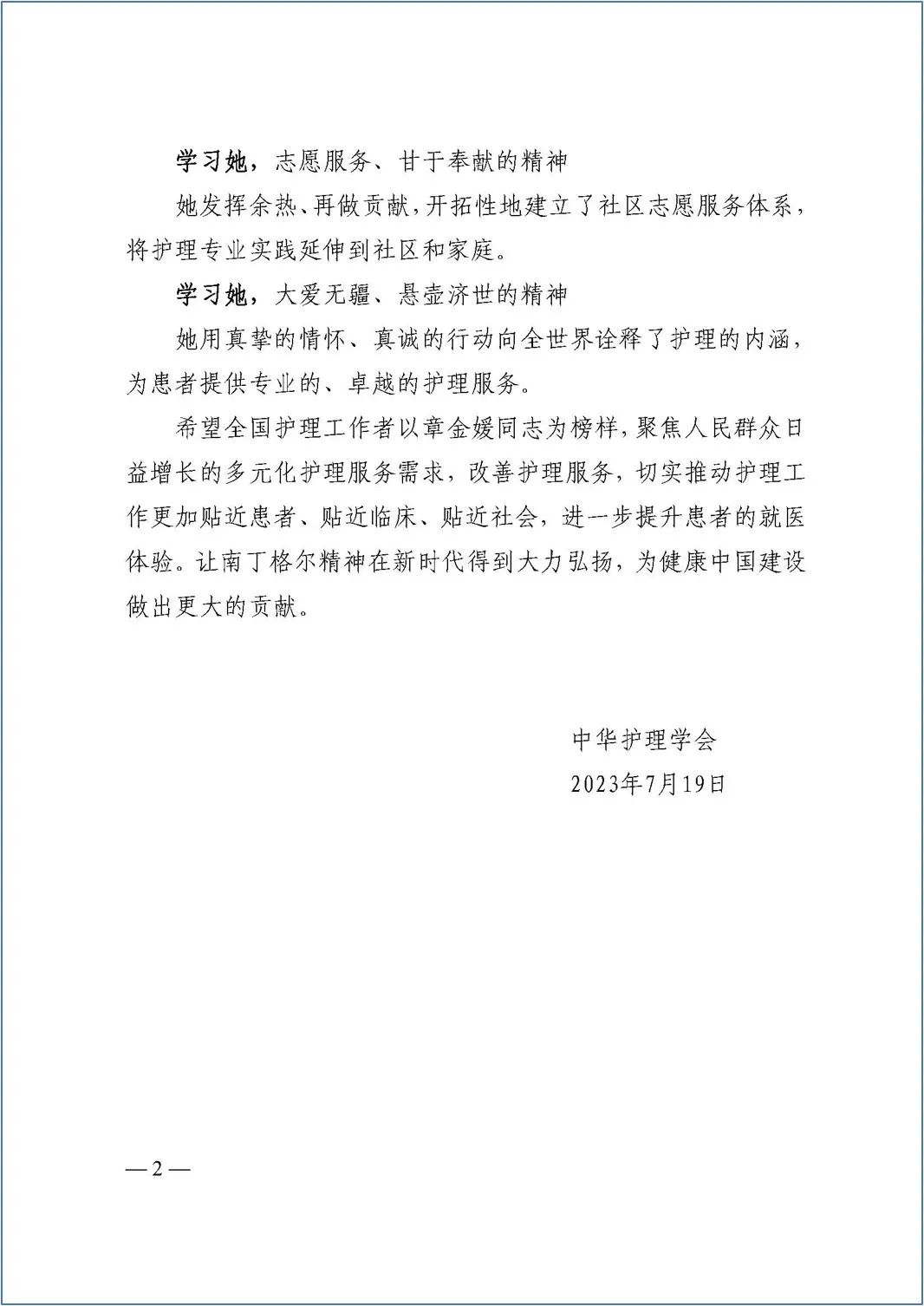 2023年,由中华护理学会推荐的护理前辈章金媛,荣获由国际护士会及佛罗伦萨南丁格尔国际基金会评选的2023年“国际成就奖”,章金媛是2023年“国际成就奖” 的全球唯一获奖者,也是中国获此殊荣的第一人。章金媛先进事迹展播