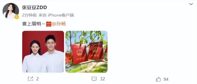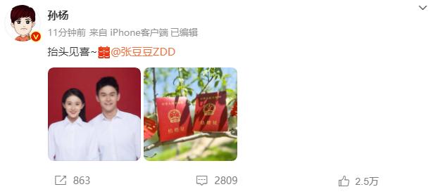 孙杨晒出两人结婚证,写道:“抬头见喜。”